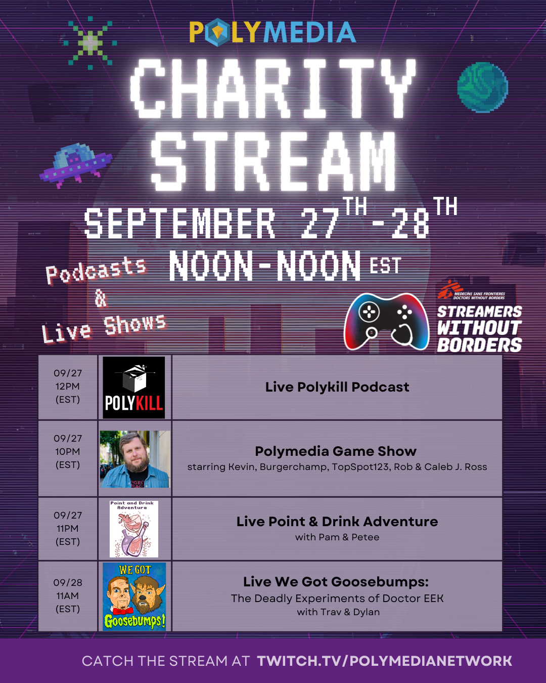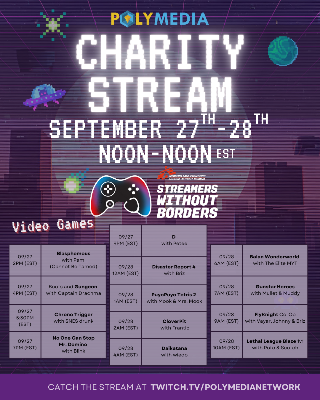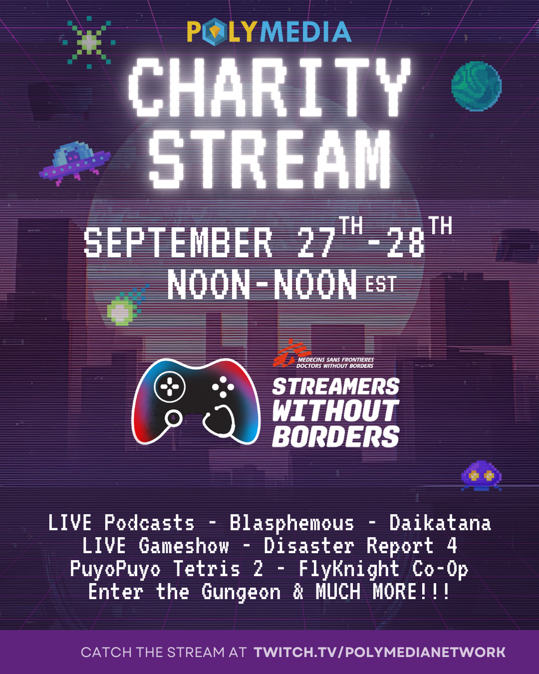 Starting Saturday, September 27th at noon EST, Polymedia will be commencing 24 hours of non-stop streaming fun to benefit Doctors Without Borders! Visit our Twitch page to catch all the action!